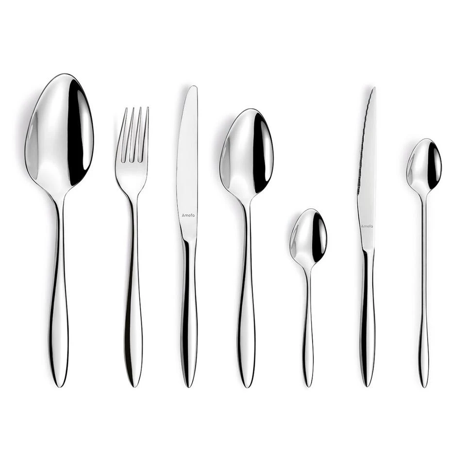 De spits toelopende handgrepen en soepele lijnen maken bestekset Ariane van Amefa een elegante verschijning. Het roestvrij staal met hoogglans afwerking geeft een tijdloze uitstraling die zich leent voor elke gelegenheid.
