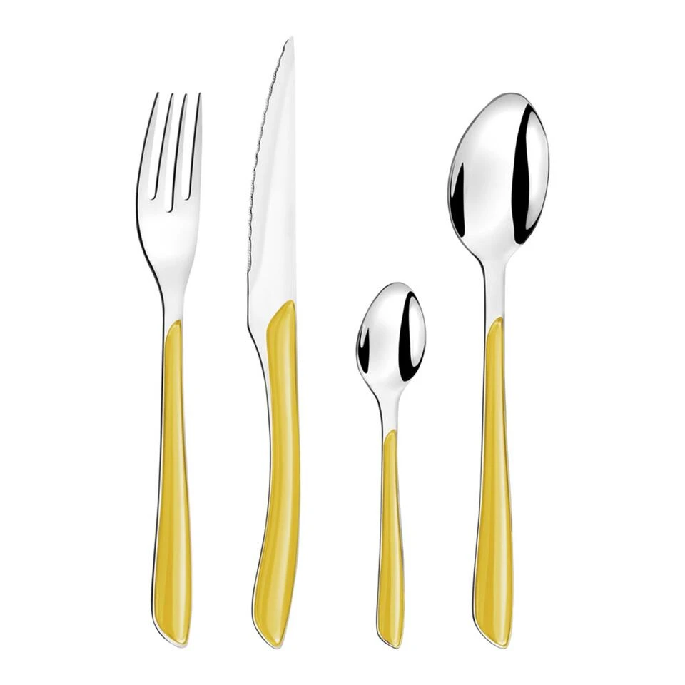 Dit Eclat bestek van Amefa heeft een gele hoogglans afwerking. Ideaal voor het creëren van een moderne en minimalistische tafelsetting bij een feestelijk diner of een gezellige barbecue.