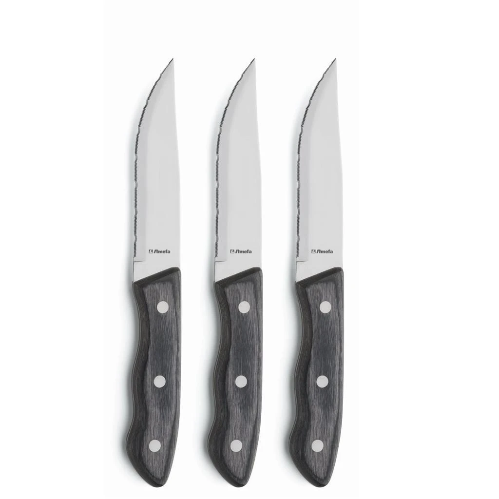 Deze robuuste Hercule steakmessen hebben een extra breed lemmet en een extra groot handvat. Het grote handvat zorgt ervoor dat de messen extra comfortabel en stevig in de hand liggen. De steakmessen hebben een lemmet gemaakt van hoogwaardig 13/0 messenstaal en houten handvat met 3 klinknagels. Het lemmet heeft een extra fijne kartel, hierdoor snij je moeiteloos door elk stuk vlees van welk formaat dan ook.