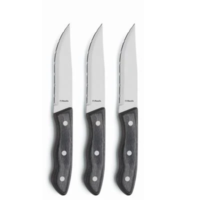 De set van 3 robuuste Hercule steakmessen van Amefa hebben een extra breed lemmet en een extra groot handvat. Het grote handvat zorgt ervoor dat de messen extra comfortabel en stevig in de hand liggen. De steakmessen hebben een lemmet gemaakt van hoogwaardig 13/0 messenstaal en houten handvat met 3 klinknagels. Het lemmet heeft een extra fijne kartel, hierdoor snij je moeiteloos door elk stuk vlees van welk formaat dan ook.
