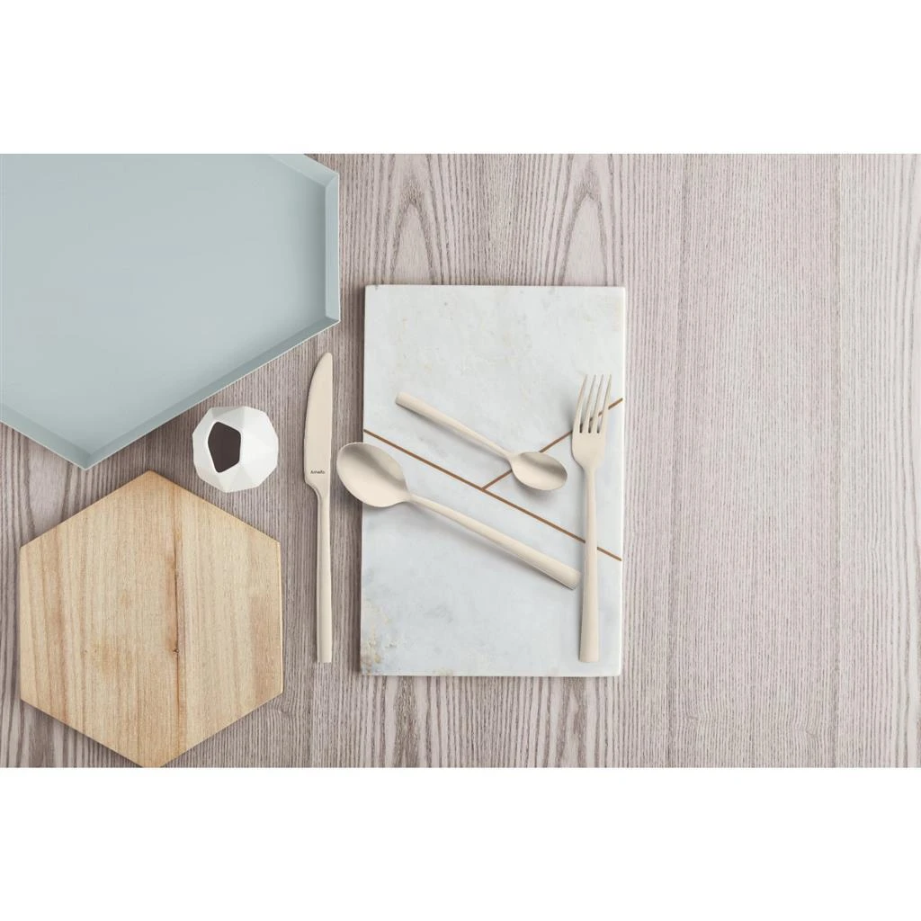 Je kan met Amefa vintage champagne bestek mooie combinaties maken en een eigen sfeer creëren. Champagne is één van de trendkleuren van dit moment. De kleur is goed te combineren met koper, wit, zwart, goud, zilver en hout, ook in je tafelsetting. De 16-delige set bestaat uit: 4 tafelmessen, 4 tafelvorken, 4 tafellepels en 4 koffielepels.