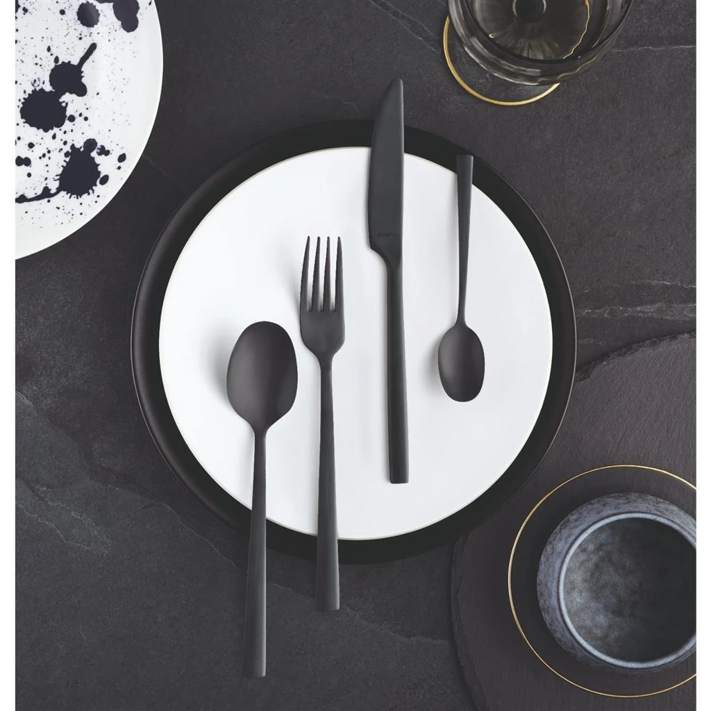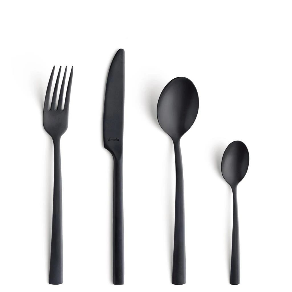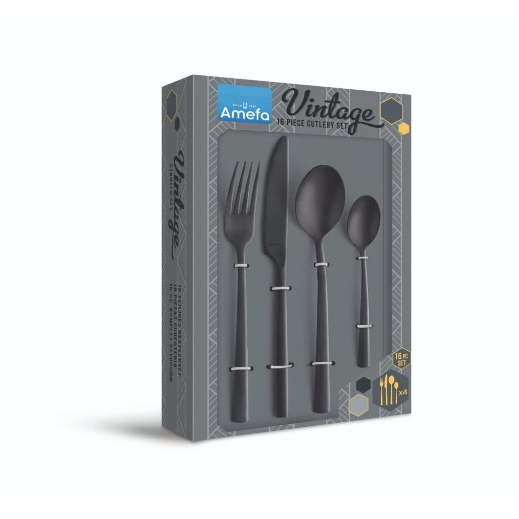 Je kan met Amefa vintagezwarte bestek mooie combinaties maken en een eigen sfeer creëren.Zwart is één van de trendkleuren van dit moment. De kleur is goed te combineren met ijsblauw, oudroze, wit, koper, goud en zilver en hout, ook in je tafelsetting. De 16-delige set bestaat uit: 4 tafelmessen, 4 tafelvorken, 4 tafellepels en 4 koffielepels.